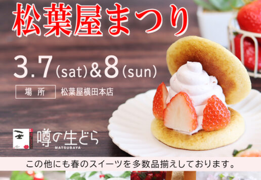 毎年恒例『春の松葉屋まつり』を開催します❣️ いちご生どら、桜モンブランにいちご桜もち、いちごロールなど見た目も華やか春を楽しんでもらえる商品を特別価格にて販売します♫ 定番の生どらもお得に...